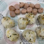 *今日の給食とおやつのおにぎりとウインナー